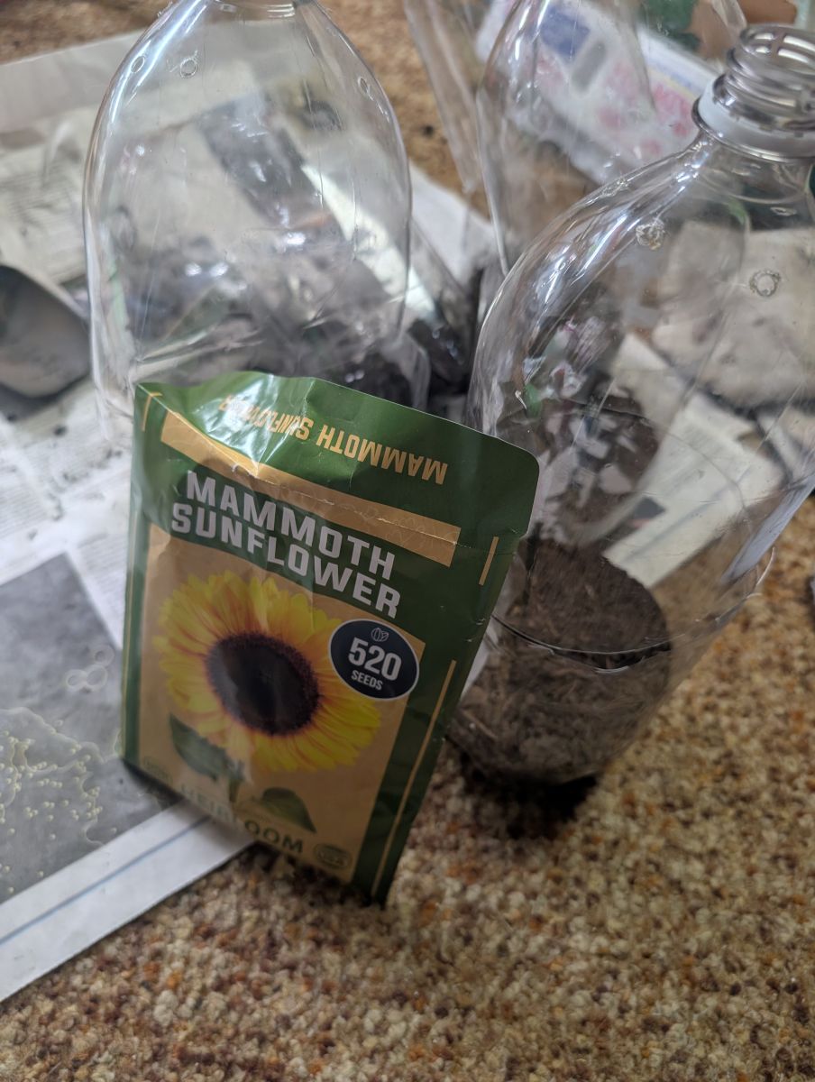 Next, carefully fill the bottom half of your container with a bout two inches of good quality potting mix, ensuring it’s evenly distributed. Once the soil is in place, gently plant the seeds within the soil, making sure to space them according to the seed packet’s recommendations if available. After planting, provide a thorough watering, ensuring the soil is moistened but not waterlogged. For our winter sowing experiment, we opted for mammoth sunflower seeds, known for their impressive size and vibrant blooms.