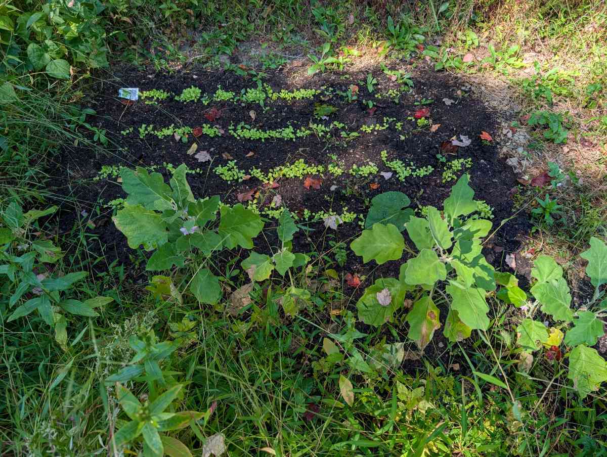 Black seed lettuce in rows behind the Eggplants in the foreground