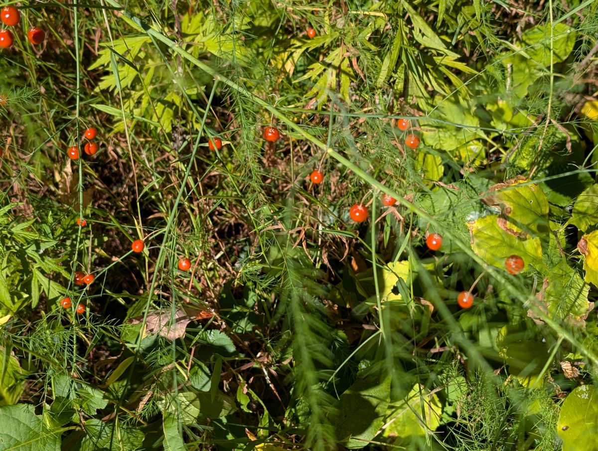 Our Asparagus garden has become overgrown with weeds and our asparagus plants have matured into feathery fronds. Red “berries” have also formed on the asparagus fronds, which turn out to be seed pods which are not edible. When the pods soften a bit, I will squeeze the seeds out onto a paper towel to dry. I will try starting asparagus plants inside during the winter. Stay tuned!